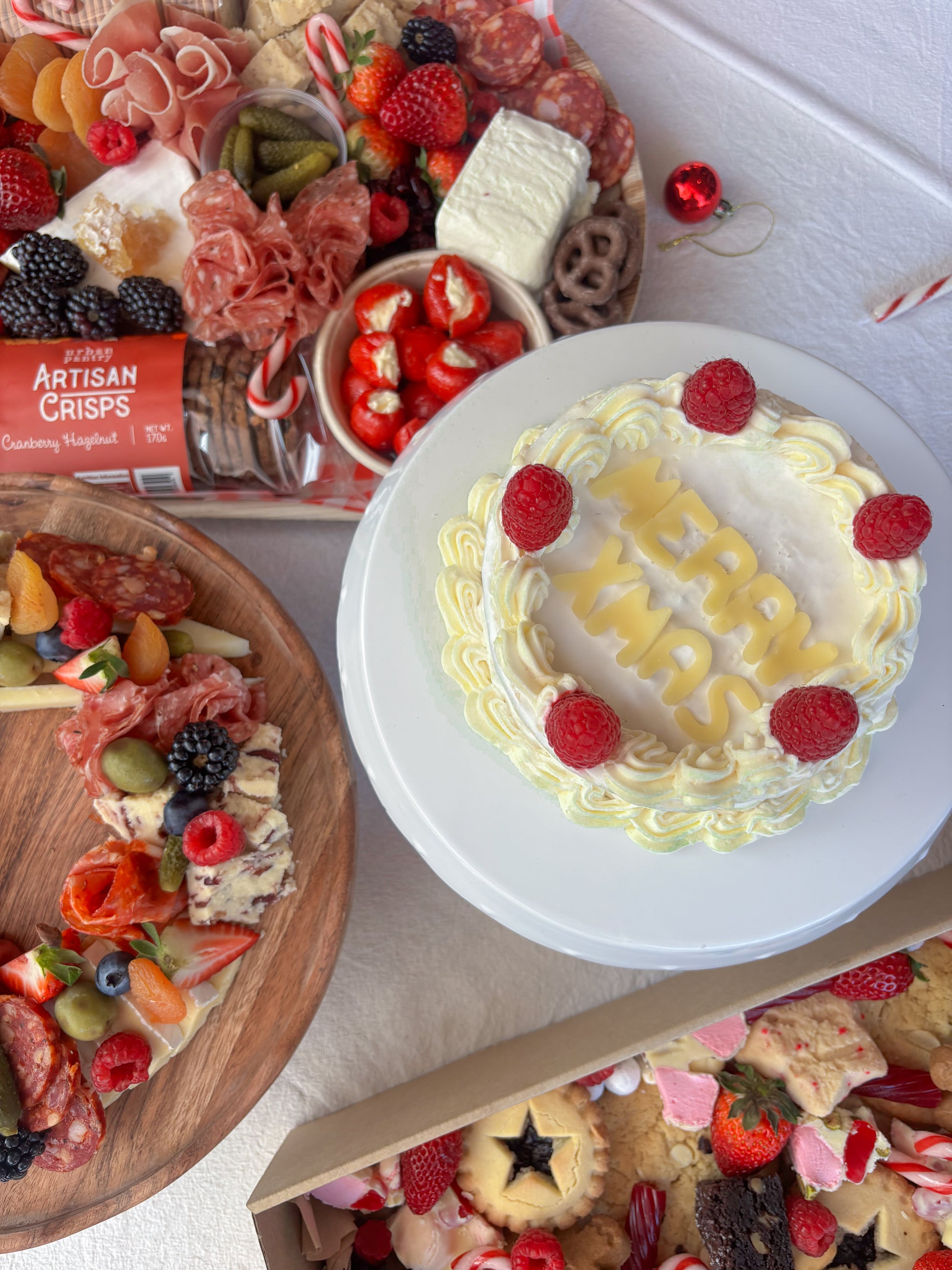 Introducing The Christmas Brie Cake, a 500g wheel of the best Brillat-Savarin triple cream brie, decorated with whipped feta piping, Merry Xmas cheese letters, berries, & paired with crackers, quince, and honeycomb. A true showstopper for any Christmas event or gifts. Recommended for 15-20.